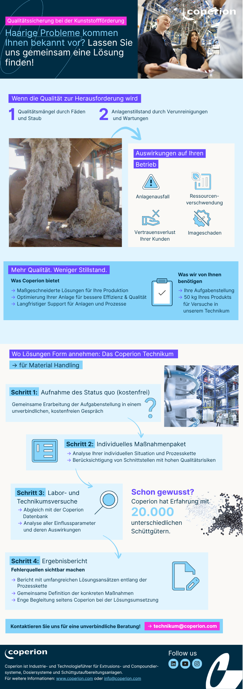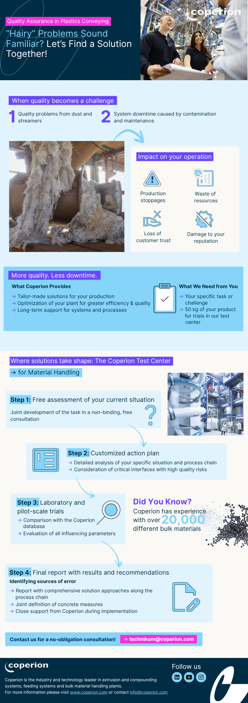 Our experts won’t leave you alone with your challenging problems! We’re your trusted partner for all bulk materials and the challenges that come with them. Let’s work together to improve your production efficiency, reduce costs, and enhance your product quality over the long term.
