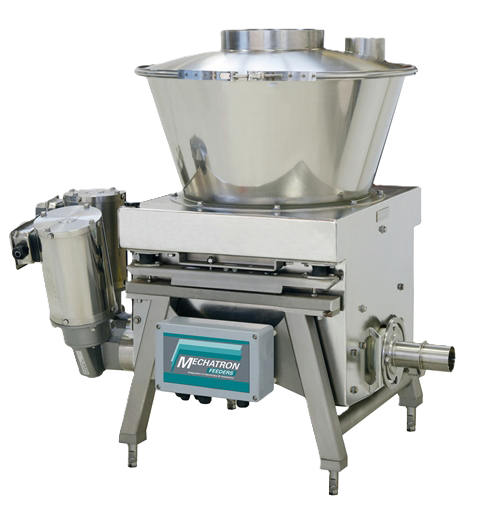The MechaTron® 3-A screw feeder was designed specifically for use in food and dairy industry process applications where equipment must meet 3-A sanitary levels or equivalent. All welds, radii, seals, surface finishes, gaskets, and contact and non-contact materials meet 3-A standards. Available product features include AC and DC drive packages, an FDA / USDA accepted “Coni-Flex™” flexible conical feed-hopper, and the ability to disassemble, clean, reconfigure, and service from the non-process side of the feeder.